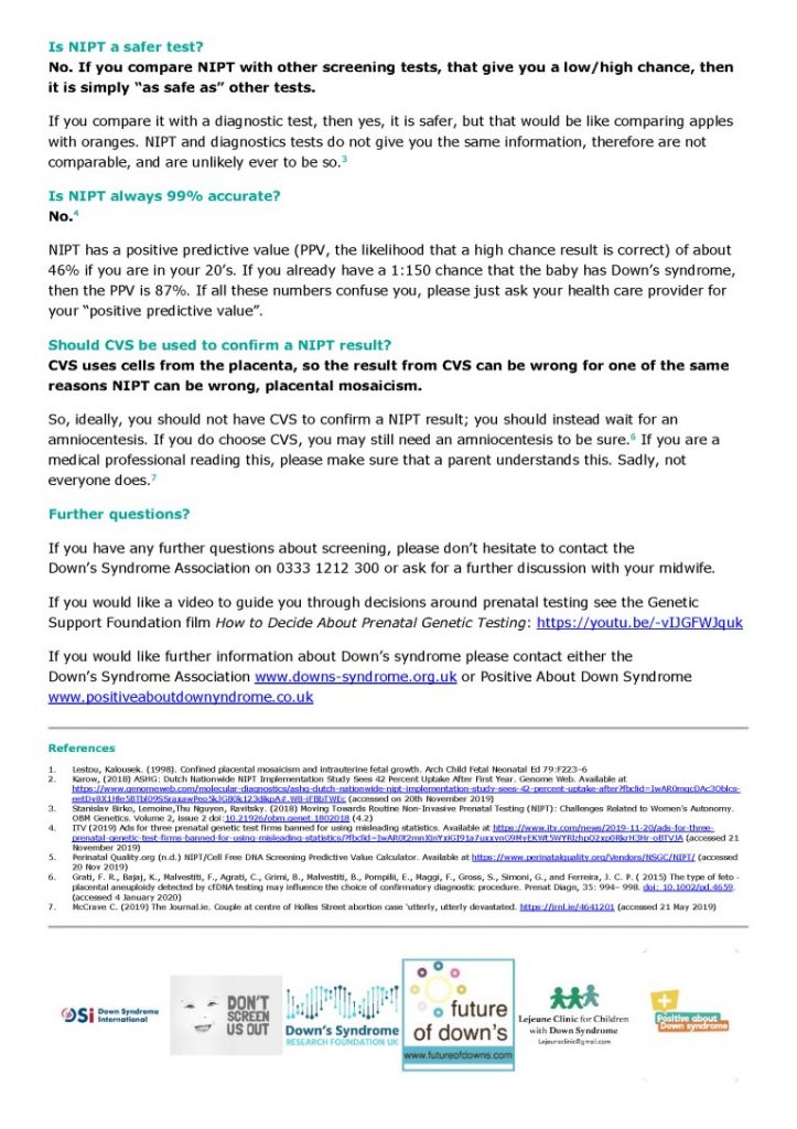 And lastly to finding out earlier. Amniocentesis is safest when done after 15 weeks. There is another diagnostic test that can be done earlier called CVS, however, remember that placental DNA? CVS also tests placental DNA, so if NIPT is incorrect, CVS might be too. So you still have to wait for an amniocentesis to be sure. Sadly, not everyone has understood that, and the advertisers should be ashamed (The Journal.ie, 2019).